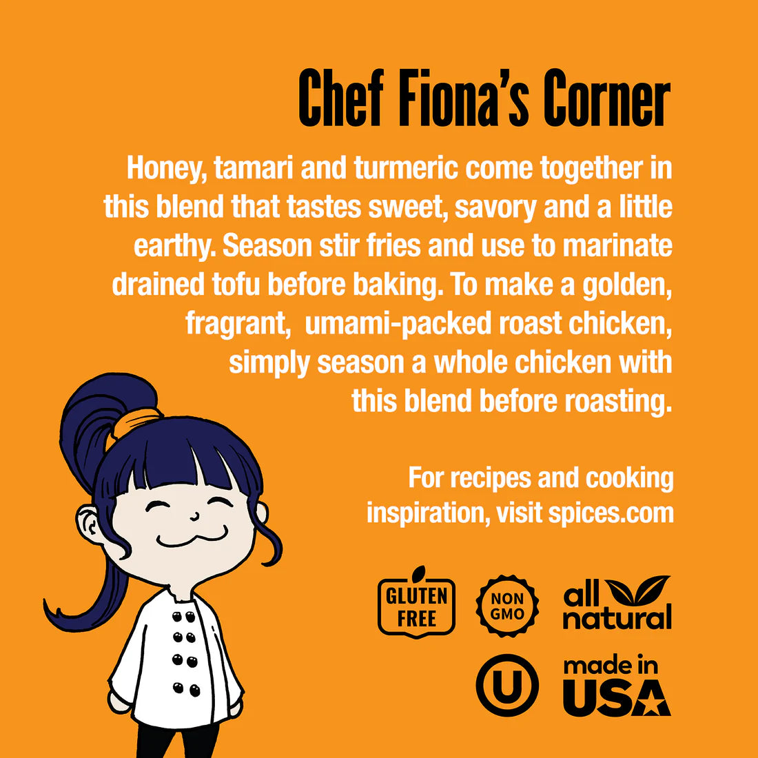 This golden-hued blend gets its color from earthy turmeric, and it has a savory profile with notes of honey. Honey, tamari and turmeric come together in this blend that tastes sweet, savory and a little earthy. Season stir fries and use to marinate drained tofu before baking. To make a golden, fragrant, umami-packed roast chicken, simply season a whole chicken with this blend before roasting.